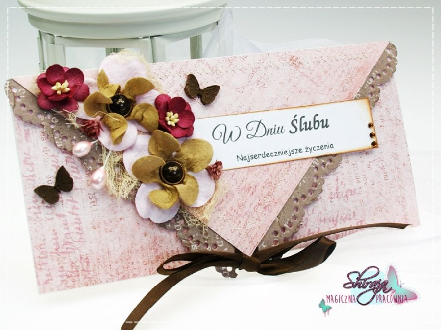 Elegancka i delikatna kartka kopertówka wykonana z wysokiej jakości papierów do scrapbookingu, obszywana maszynowo. Kartka bogato ozdobiona papierowymi kwiatami, oraz motylami. W środku znajduje się wkładka na życzenia z cytatem.