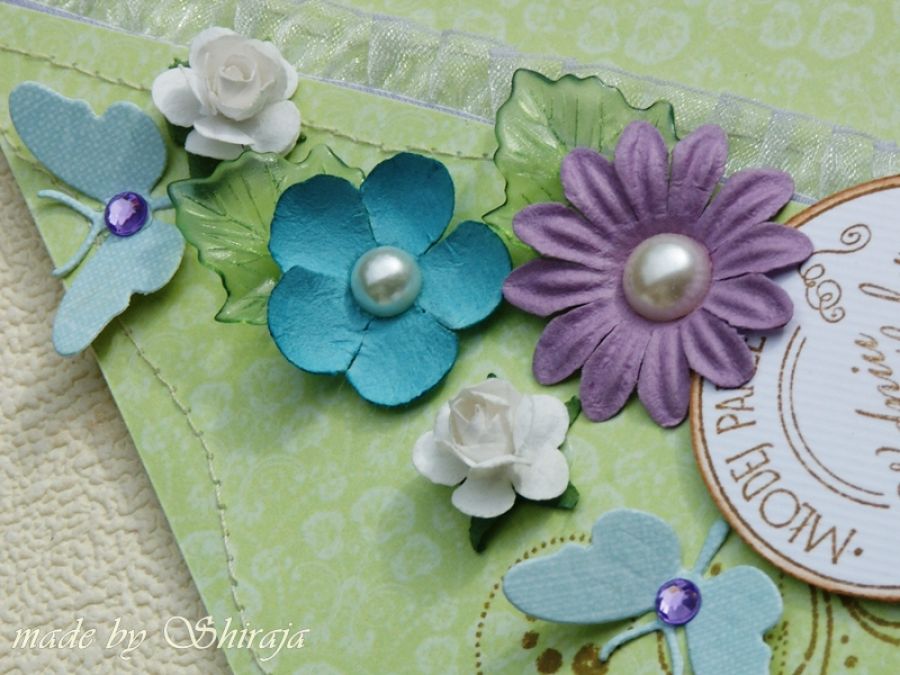 Kartka kopertówka wykonana z wysokiej jakości papierów do scrapbookingu, obszywana maszynowo. W tonacji zielono-fioletowej i odrobiną turkusu. Uroku dodają papierowe kwiaty i motyle. W środku wkładka z cytatem V.Barreto.