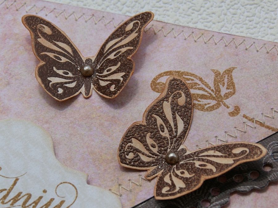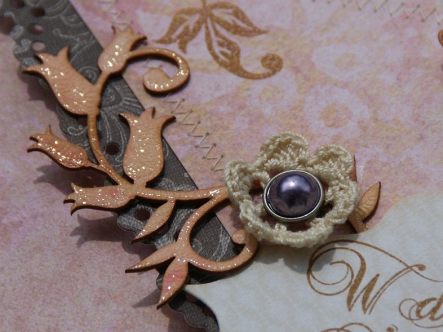 Kartka kopertówka wykonana z wysokiej jakości papierów do scrapbookingu, obszywana maszynowo. Uroku dodają motylki wykonane techniką embossingu na gorąco, oraz gałązka pokryta preparatem dającym efekt spękań. Do tego szydełkowy kwiat i ręcznie stemplowane roślinne motywy..