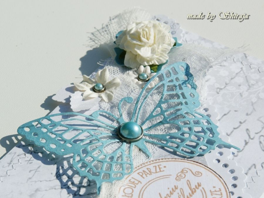 Elegancka i delikatna kartka kopertówka wykonana z wysokiej jakości papierów do scrapbookingu, obszywana maszynowo. Kartka ozdobiona ażurowym motylem, papierowymi kwiatuszkami oraz kryształkami. W środku znajduje się wkładka na życzenia z cytatem.