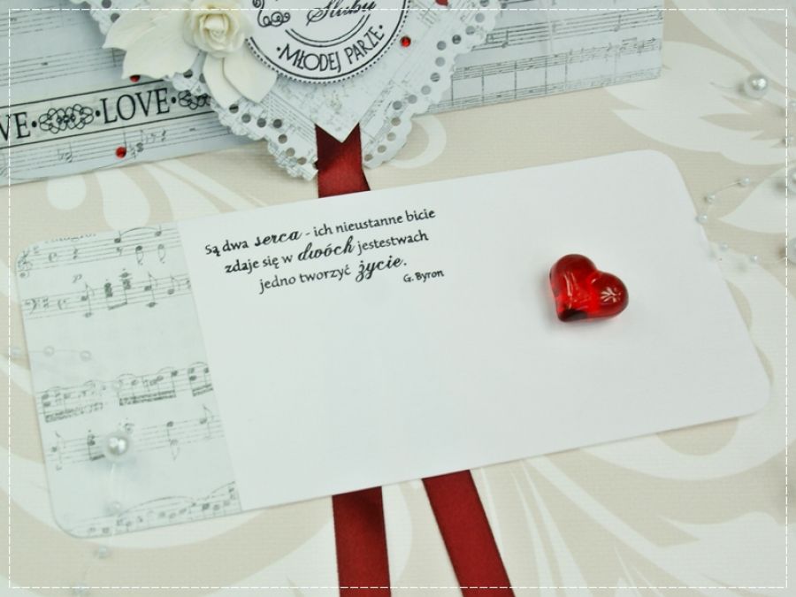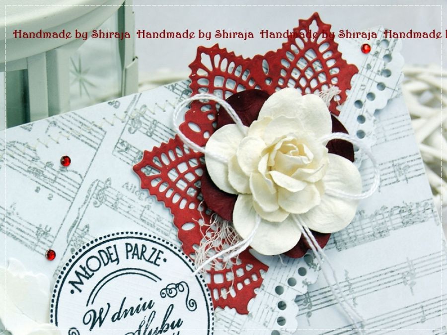 Elegancka i delikatna kartka kopertówka wykonana z wysokiej jakości papierów do scrapbookingu, obszywana maszynowo. Kartka ozdobiona papierowymi kwiatami, ażurowa serwetką oraz kryształkami. W środku znajduje się wkładka na życzenia z cytatem.