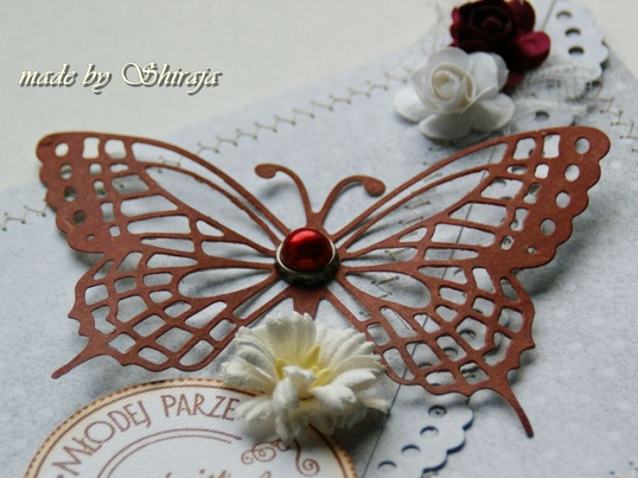 Elegancka i delikatna kartka kopertówka wykonana z wysokiej jakości papierów do scrapbookingu, obszywana maszynowo. Kartka ozdobiona papierowymi kwiatami, kryształkami oraz ażurowym motylem. W środku znajduje się wkładka na życzenia z cytatem.