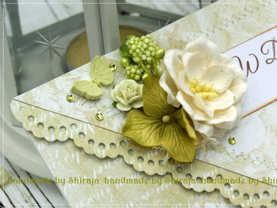 Elegancka i delikatna kartka kopertówka wykonana z wysokiej jakości papierów do scrapbookingu, obszywana maszynowo. Kartka ozdobiona papierowymi kwiatami, motylem oraz kryształkami. W środku znajduje się wkładka na życzenia z cytatem.