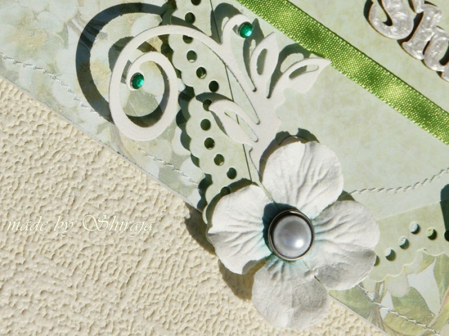 Kartka typu kopertówka wykonana z wysokiej jakości papieru do scrapbookingu, obszywana maszynowo. Ozdobiona papierowymi kwiatami, motylami , oraz napisem pokrytym perłową farbką. W środku wkładka z cytatem H. Sienkiewicza. w komplecie z kopertą