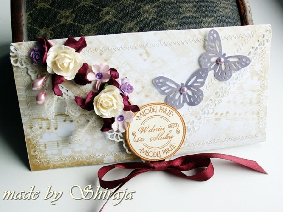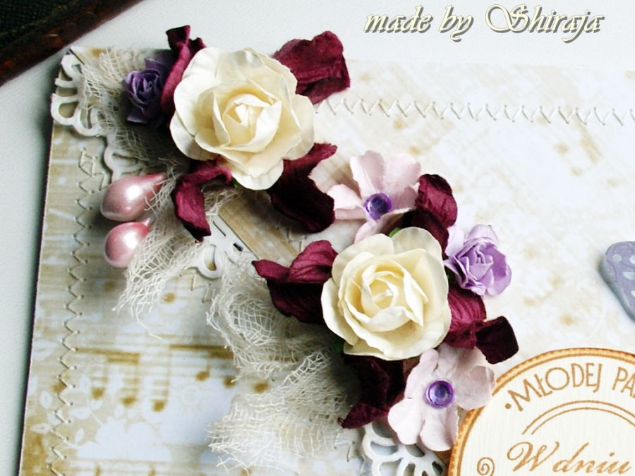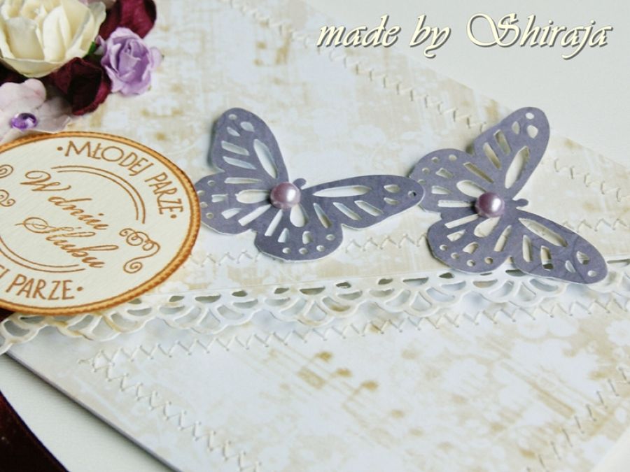 Elegancka i delikatna kartka kopertówka wykonana z wysokiej jakości papierów do scrapbookingu, obszywana maszynowo. Kartka ozdobiona papierowymi kwiatami, perełkami, oraz motylami. W środku znajduje się wkładka na życzenia z cytatem.
