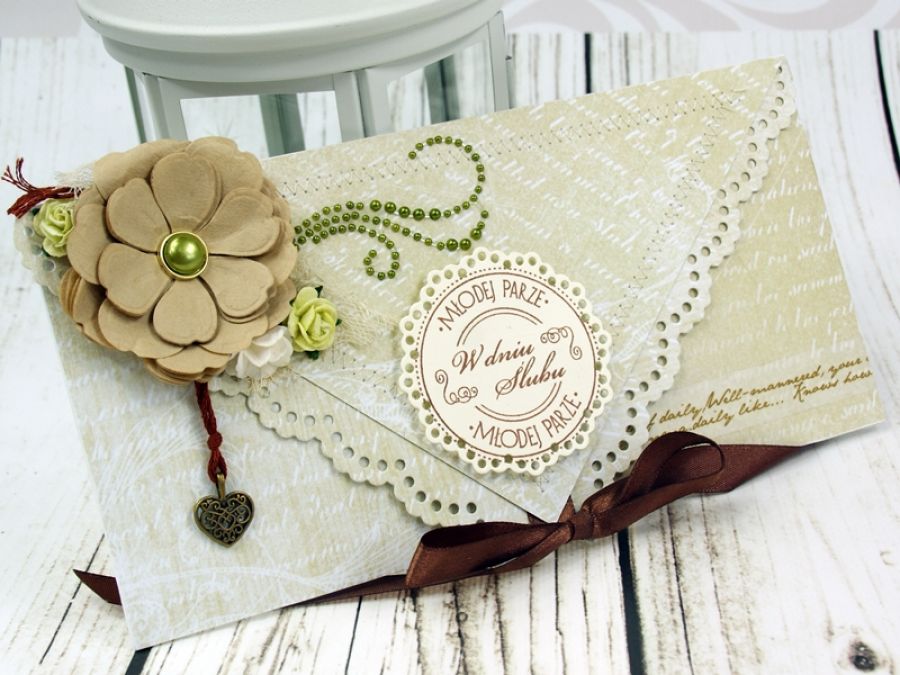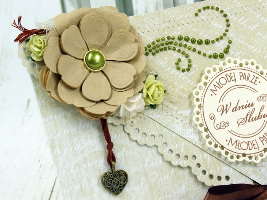 Elegancka kartka kopertówka wykonana z wysokiej jakości papierów do scrapbookingu, obszywana maszynowo. Kartka zdobiona papierowymi kwiatami oraz metalową zawieszką