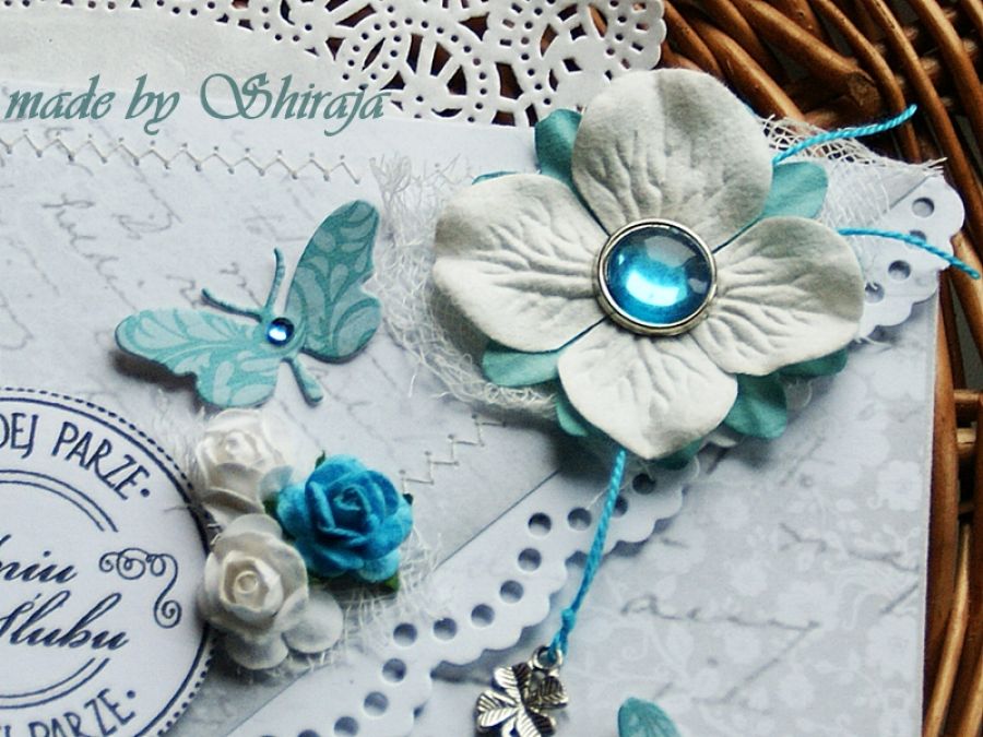Elegancka i delikatna kartka kopertówka wykonana z wysokiej jakości papierów do scrapbookingu, obszywana maszynowo. Kartka ozdobiona papierowymi kwiatami, motylami oraz uroczą koniczynką. W środku znajduje się wkładka na życzenia z cytatem.