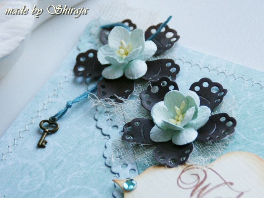 Elegancka i delikatna kartka kopertówka wykonana z wysokiej jakości papierów do scrapbookingu, obszywana maszynowo. Kartka ozdobiona papierowymi kwiatami, kryształkami oraz zawieszką - kluczykiem. W środku znajduje się wkładka na życzenia z cytatem.