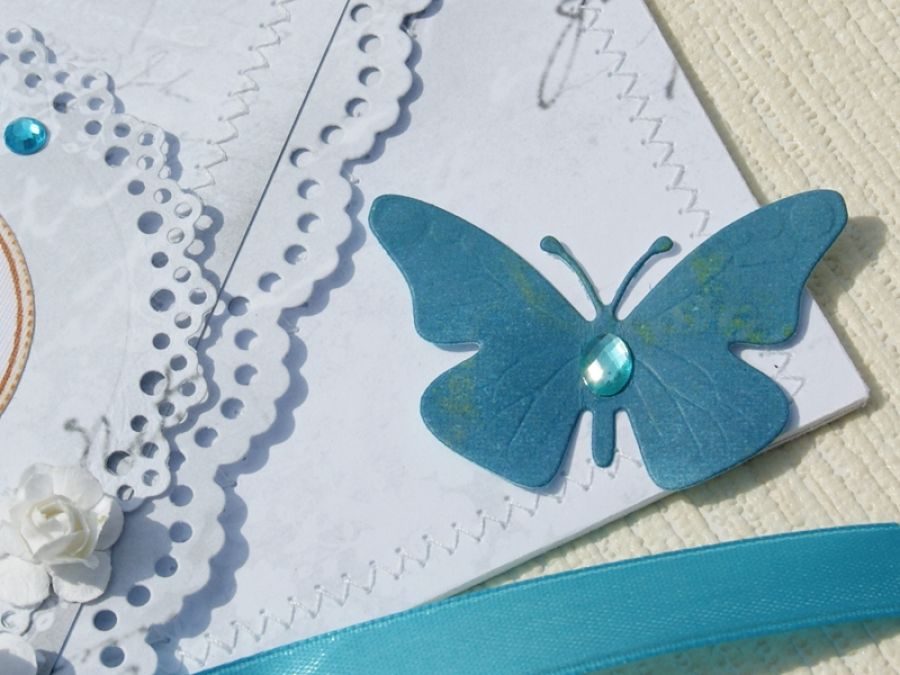 Kartka typu kopertówka wykonana z wysokiej jakości papieru do scrapbookingu, obszywanych maszynowo. Ozdobiona papierowymi kwiatuszkami, listkami, oraz motylem i kryształkami.