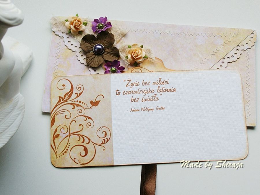 Elegancka i delikatna kartka kopertówka wykonana z wysokiej jakości papierów do scrapbookingu, obszywana maszynowo. Kartka ozdobiona papierowymi kwiatami, kryształkami oraz perełkami. W środku znajduje się wkładka na życzenia z cytatem.