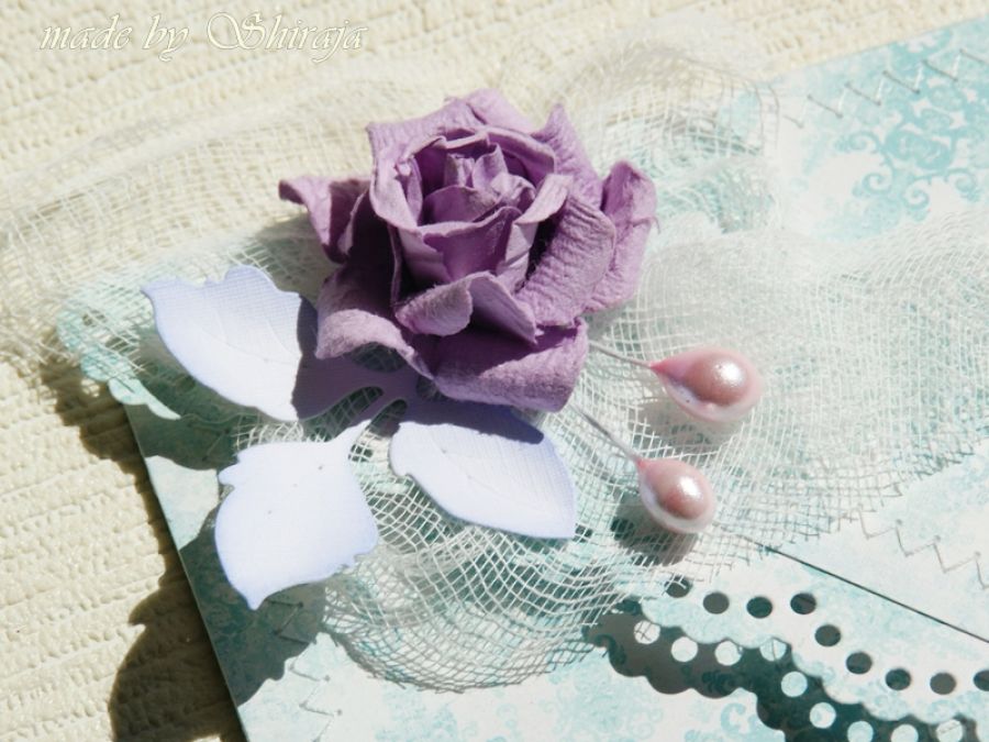 Kartka typu kopertówka wykonana z wysokiej jakości papieru do scrapbookingu, obszywana maszynowo. Ozdobiona wrzosową różą, delikatnymi listkami i motylami , W środku wkładka z cytatem
