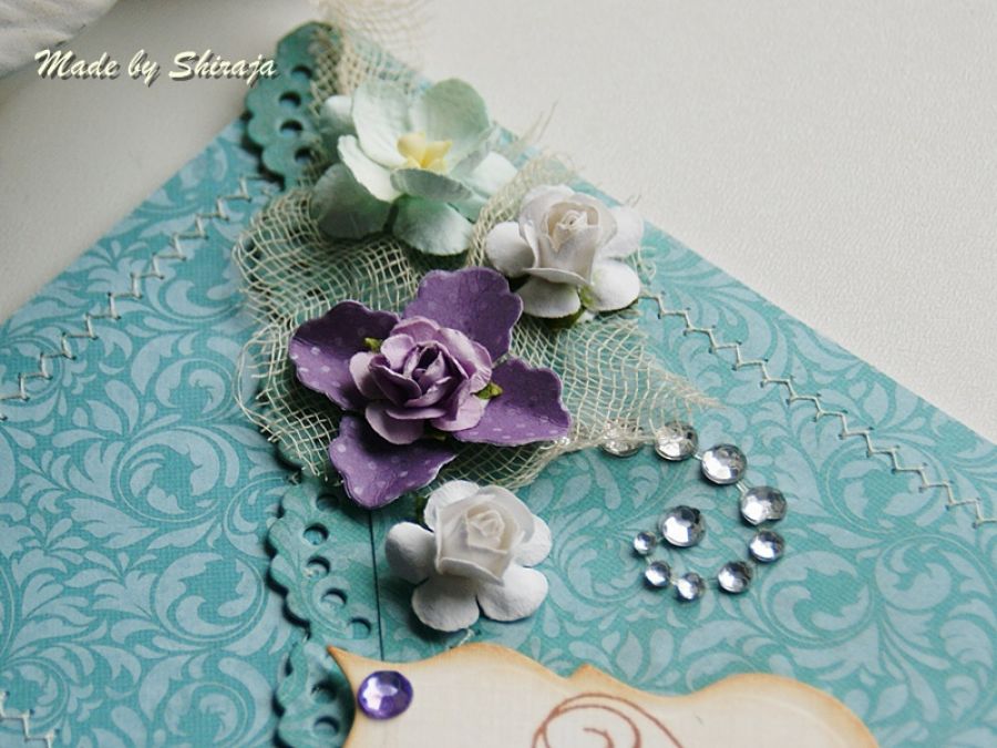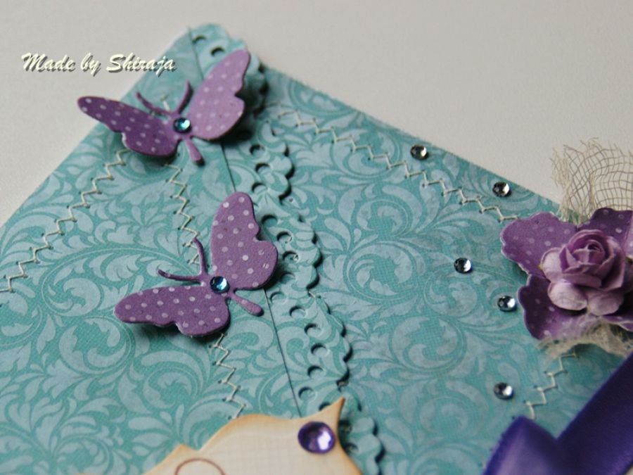 Elegancka i delikatna kartka kopertówka wykonana z wysokiej jakości papierów do scrapbookingu, obszywana maszynowo. Kartka ozdobiona papierowymi kwiatami, kryształkami oraz motylami. W środku znajduje się wkładka na życzenia z cytatem.