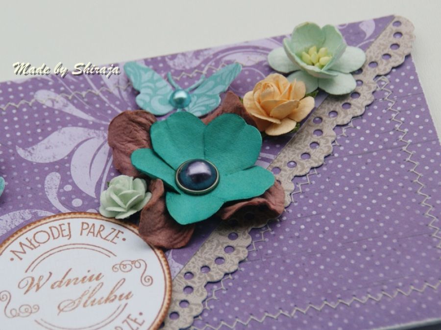Elegancka i delikatna kartka kopertówka wykonana z wysokiej jakości papierów do scrapbookingu, obszywana maszynowo. Kartka ozdobiona papierowymi kwiatami, oraz perełkami. W środku znajduje się wkładka na życzenia z cytatem.