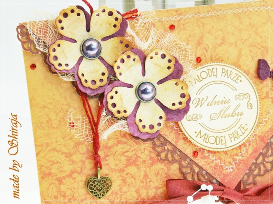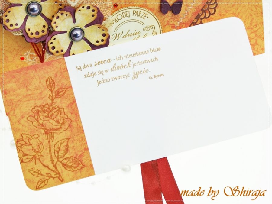 Elegancka i delikatna kartka kopertówka wykonana z wysokiej jakości papierów do scrapbookingu, obszywana maszynowo. Kartka ozdobiona papierowymi kwiatami, motylami wykonanymi ze specjalnej masy oraz kryształkami i zawieszką serduszkiem. W środku znajduje się wkładka na życzenia z cytatem.