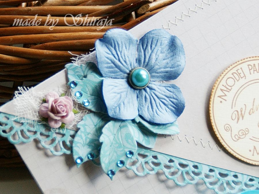 Elegancka i delikatna kartka kopertówka wykonana z wysokiej jakości papierów do scrapbookingu, obszywana maszynowo. Kartka ozdobiona papierowymi kwiatami, oraz motylami. W środku znajduje się wkładka na życzenia z cytatem.