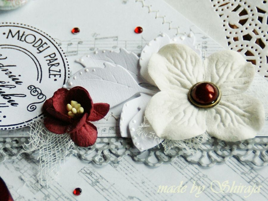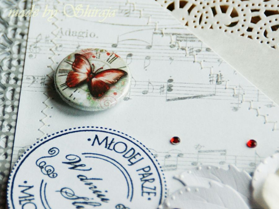 Elegancka i delikatna kartka kopertówka wykonana z wysokiej jakości papierów do scrapbookingu, obszywana maszynowo. Kartka ozdobiona papierowymi kwiatami, kryształkami oraz uroczym motylem. W środku znajduje się wkładka na życzenia z cytatem.