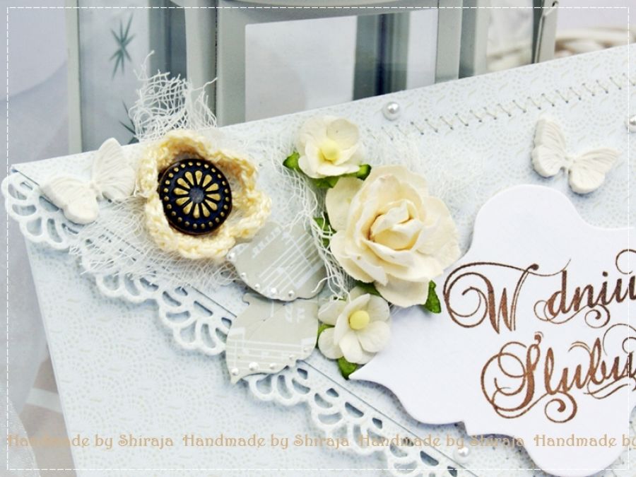 Elegancka i delikatna kartka kopertówka wykonana z wysokiej jakości papierów do scrapbookingu, obszywana maszynowo. Kartka ozdobiona papierowymi i szydełkowym kwiatem, motylami oraz perełkami. W środku znajduje się wkładka na życzenia z cytatem.