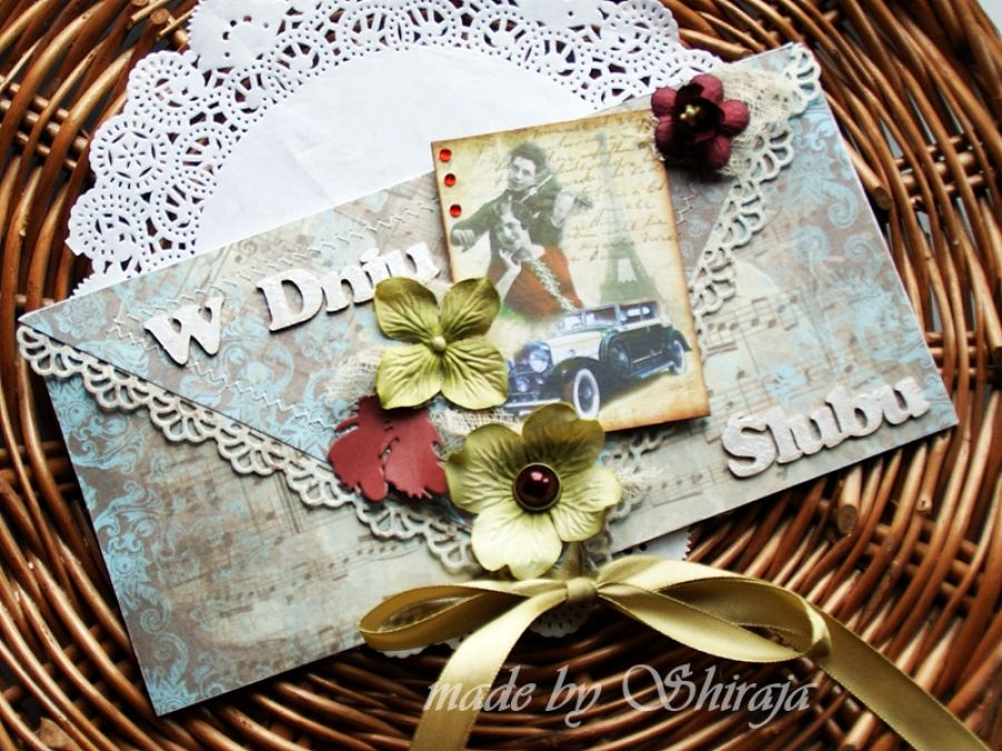Elegancka i delikatna kartka kopertówka wykonana z wysokiej jakości papierów do scrapbookingu, obszywana maszynowo. Kartka ozdobiona papierowymi kwiatami, oraz retro obrazkiem. W środku znajduje się wkładka na życzenia z cytatem.