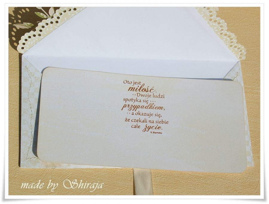 Kartka kopertówka wykonana z wysokiej jakości papierów do scrapbookingu, obszywana maszynowo. Uroku dodają kwiaty z koralikami w środku oraz motyl i listki. W środku wkładka z cytatem V. Barreto