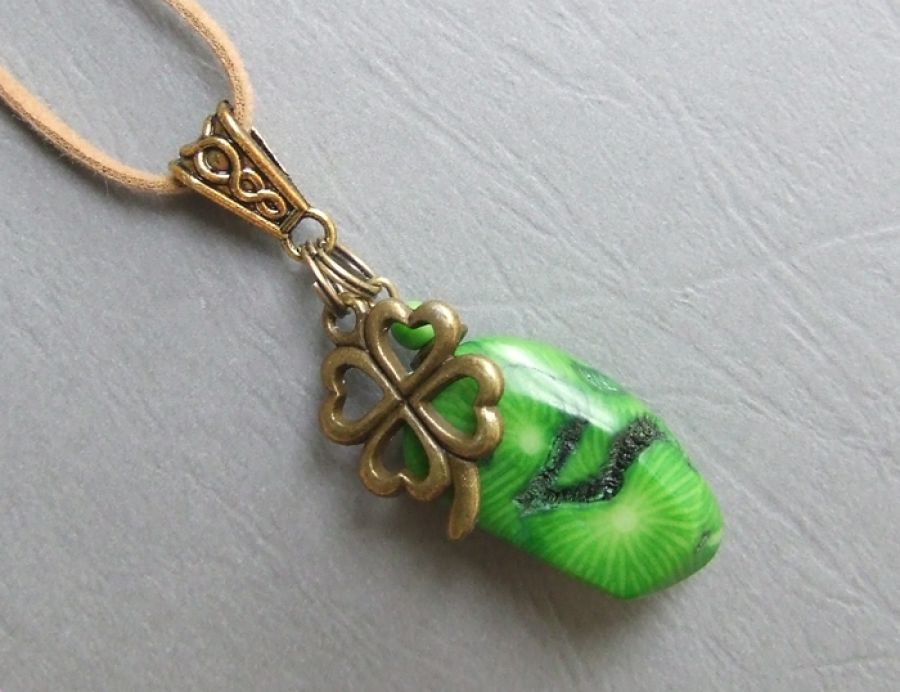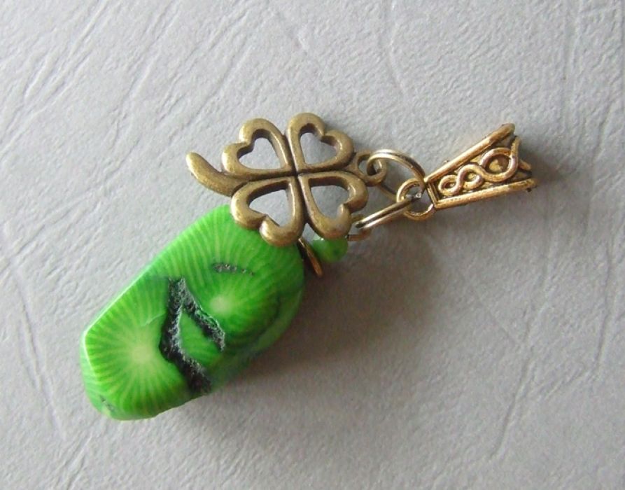 Wisior wykonany z naturalnego, bardzo nieregularnego korala -robaczywki w kolorze żywej zieleni oraz elementów w kolorze starego złota.