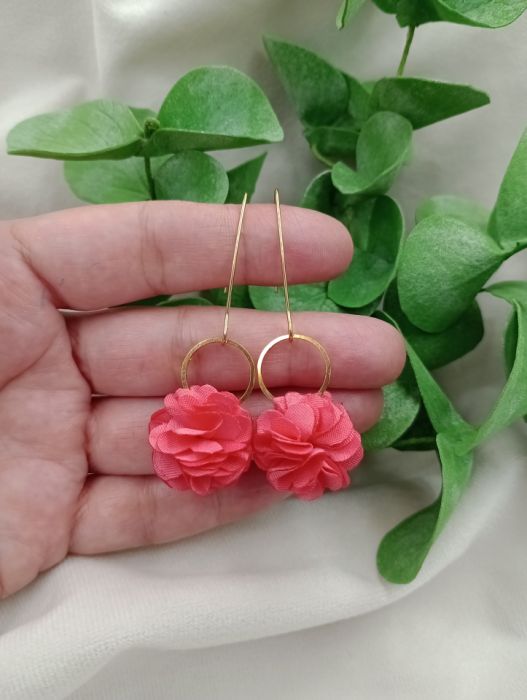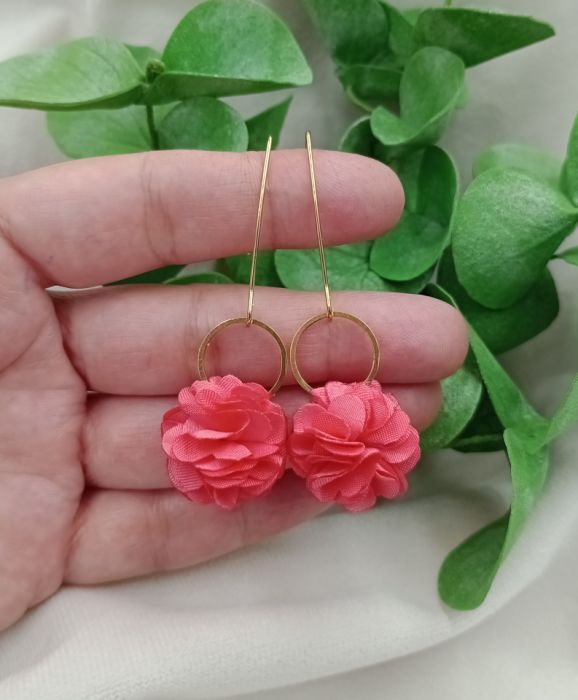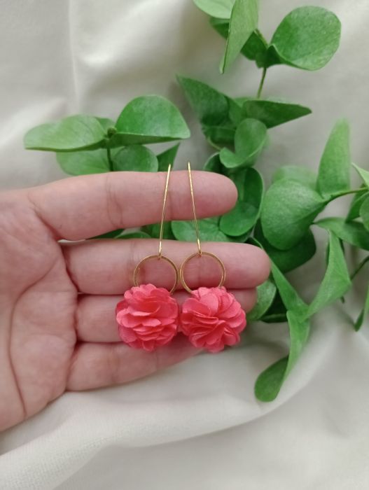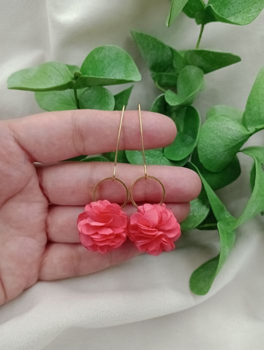 Kolczyki kwiatki wykonywane ręcznie z wiskozy w koralowym odcieniu.