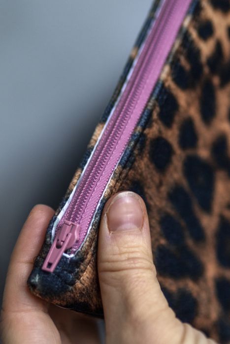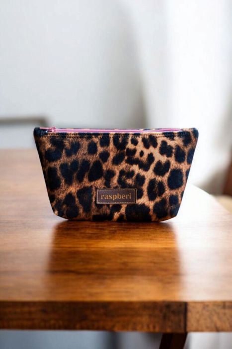 Średniej wielkości kosmetyczka wykonana z weluru w panterkę.