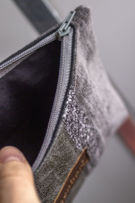 Średniej wielkości kosmetyczka wykonana kilku rodzajów tkanin. Stworzona w duchu no waste.