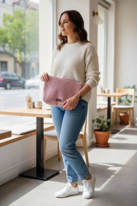 Duża kosmetyczka podróżna wykonana z pudroworóżowej bukli.
