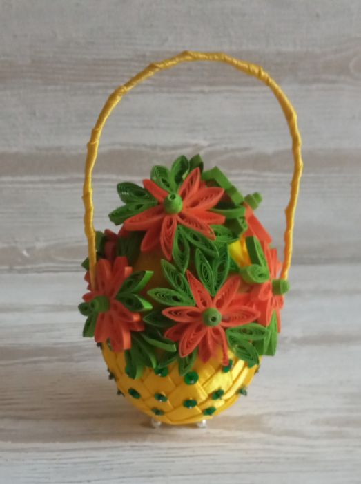 Ręcznie zdobione jajko, stylizowane jako koszyczek w technice quillingu. Technika bardzo czasochłonna. Bazą do zdobienia jest jajko styrpianowe. Kolorowa paseczki papieru klejone, zwijane i kształtowane w odpowiednie wzory za pomocą narzędzi do quillingu. Dół jajka - koszyczek zrobiony z satynowej wstążki. Zdobiony cekinami. Zaletą tego typu ozdób HANDMADE jest to, że są nietłukące. doskonale sprawdzą się w domu gdzie są małe dzieci lub zwierzęta. Będzie oryginalnym prezentem na święta dla kogoś bliskiego. Podarowana koleżance w pracy czy szefowi będzie nietuzinkowym prezentem. Przed wysłaniem zostanie ładnie zapakowany.
