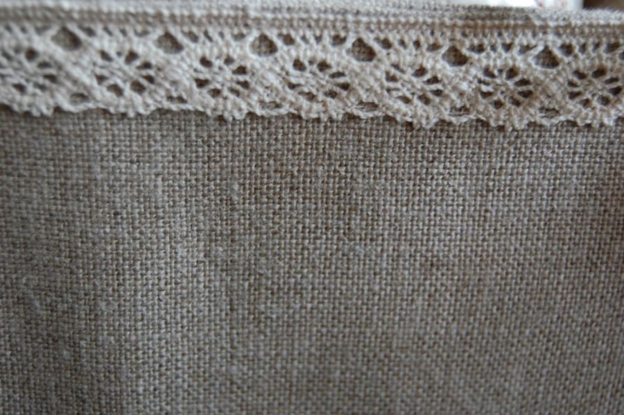 Tekstylny koszyk - dwustronny, uszyty z beżowego lnu. Wierzchnia część ozdobiona bawełnianą koronką w kolorze ecri, naszywaną równo z brzegiem górnej krawędzi. Ścianki i spód koszyka wzmocnione zostały plastikowym tworzywem, dzięki czemu można go prać ręcznie. Wiązania wykonane z tego samego materiału - są przez to sztywne, i w odróżnieniu od wiązań z satynowych, bawełnianych tasiemek ładniej się prezentują. Wymiary: 20 cm x 20 cm x 9 cm (wysokość)