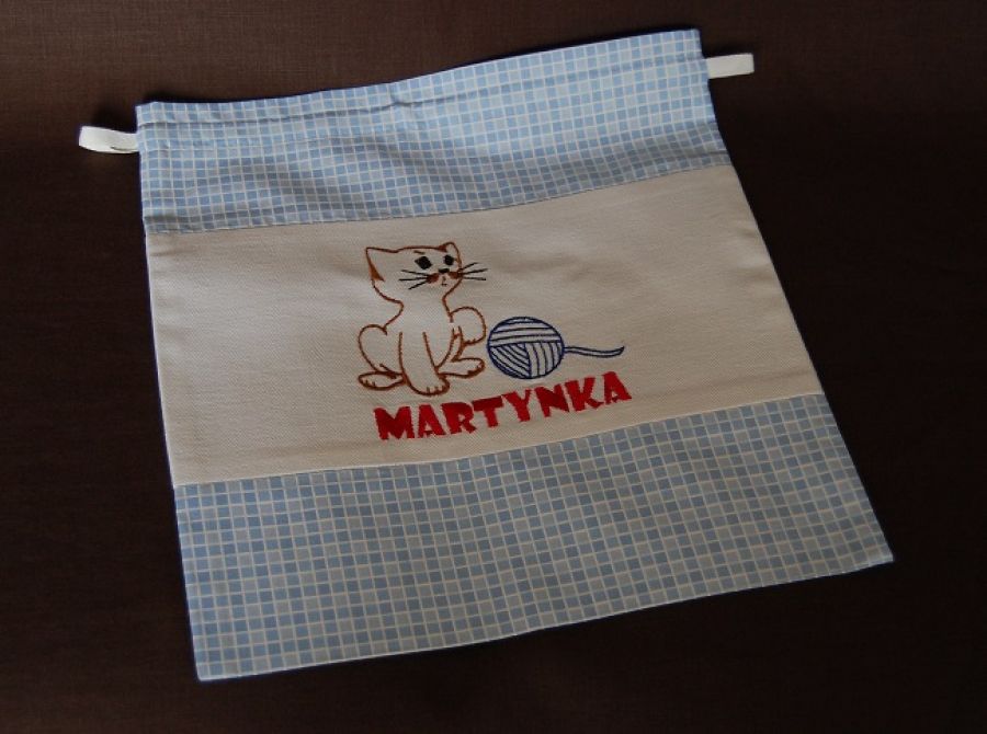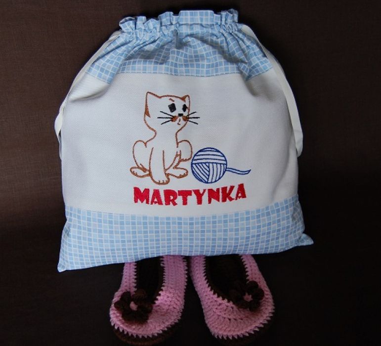 Worek na kapcie/strój -połączenie kraciastej tkaniny z białą bawełną, na której został wyhaftowany kotek z kłębkiem włóczki oraz imię dziecka. Tył woreczka w kratkę. Na górze tunel, a w środku dwie bawełniane tasiemki ściągające woreczek.
