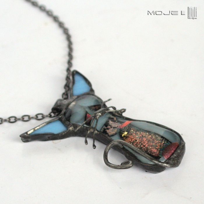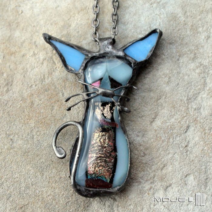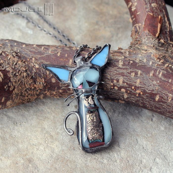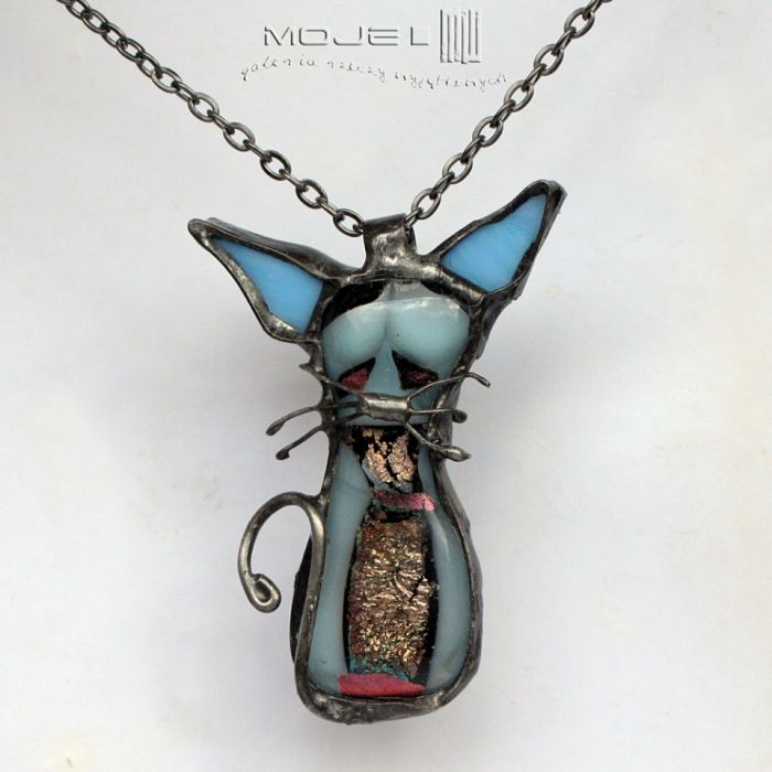 Wisiorek ze szkła w formie stylizowanego kota. Wytopiłam go ze szkła bullsey szaroniebieskiego i błękitnego oraz dichroicznego, które opalizuje w świetle.