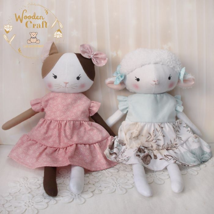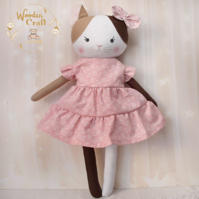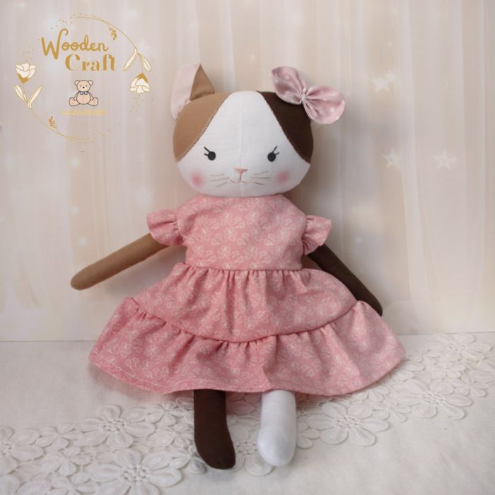 Przeurocza przytulanka, Kicia trikolorka uszyta ręcznie z najwyższą starannością, ubrana w sukieneczkę w kolorze różowym, w drobne kwiatuszki. Wykonana ze 100% bawełny, wypełniona antyalergiczną kulką silikonową. Oczka malowane wodoodpornym markerem, nosek i uśmiech wyszyty muliną, uszko ozdobione kokardką. Górne i dolne łapki układają się luźno, kicia siedzi z podparciem. Sukieneczkę można swobodnie zdejmować, jest zapinana na rzep.