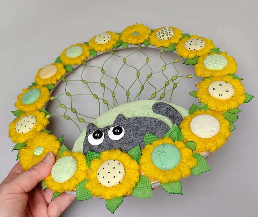 Filcowy kotek szaraczek o melancholijnym spojrzeniu jest otoczony kwiatami z żółtej włóczki.