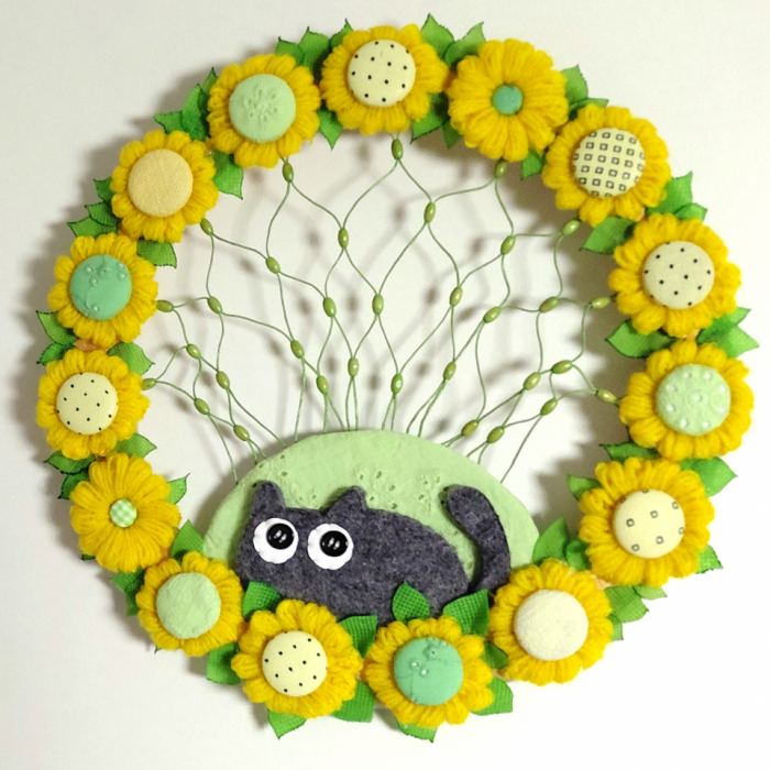 Dekoracja do powieszenia na ścianie lub drzwiach, w żółto-zielono-szarej tonacji kolorystycznej. Z tyłu przymocowałam metalowy element do zawieszenia (z ząbkami ułatwiającymi dokładne usytuowanie dekoracji w pożądanym położeniu).
