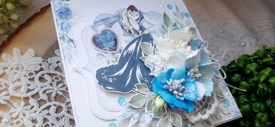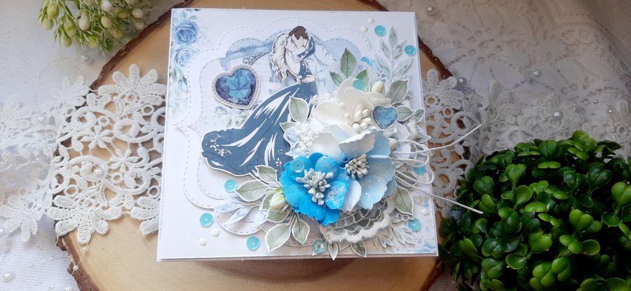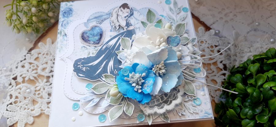 Kartka okolicznościowa do pudełka. Kartka jest bogato zdobiona kwiatami i innymi dodatkami. W środku kartka na życzenia podklejona taśmą dwustronną. Wymiary kartki 14x14 cm. W zestawie z pudełkiem o wymiarach 14,5x14x5x3 cm.