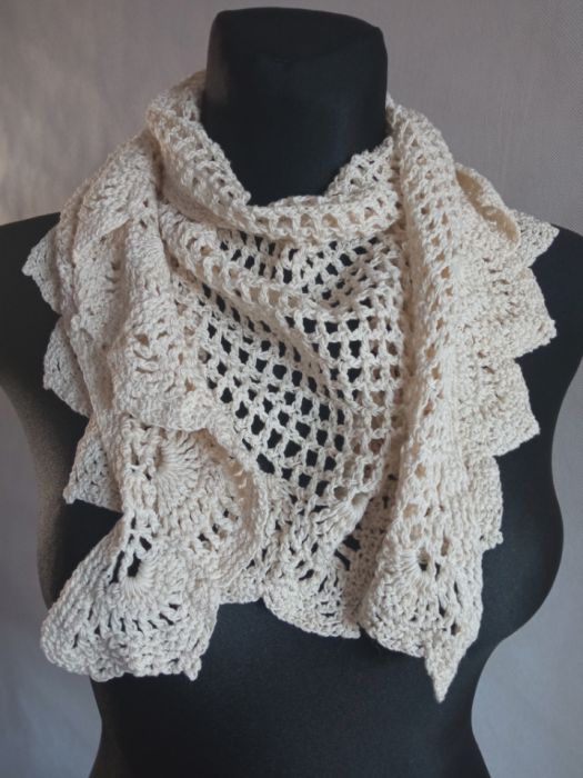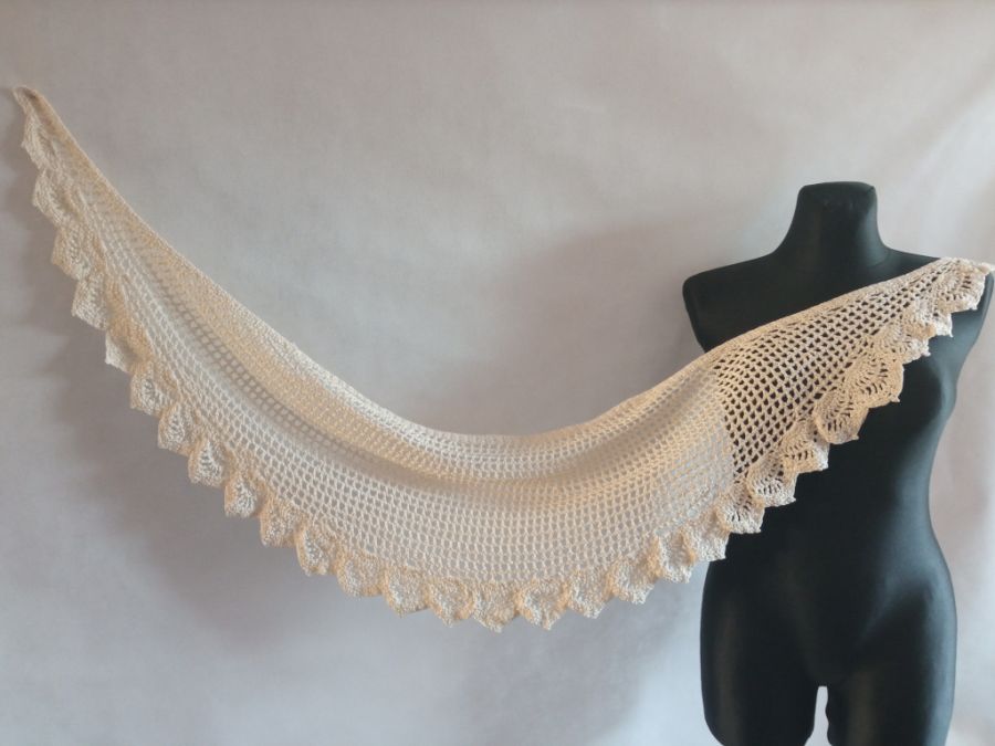 Chusta wykonana jest szydełkiem z bawełny w jasnym, kremowym kolorze wzorem siatkowym i wykończona koronkowym brzegiem.