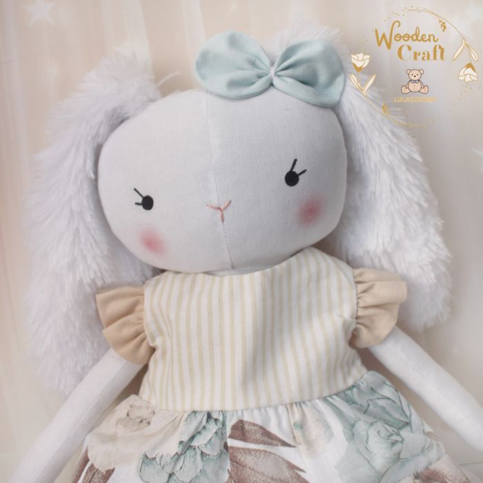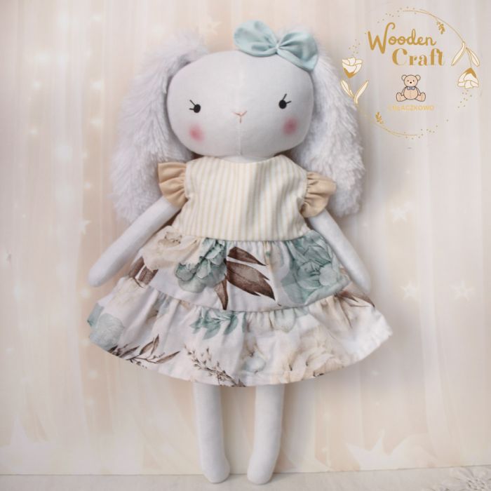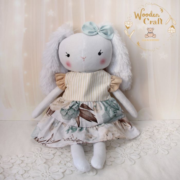 Przeurocza przytulanka, króliczek, a właściwie królisia cała w bieli, uszyta ręcznie z najwyższą starannością, ubrana w beżowo-miętową sukieneczkę w kwiaty. Wykonana ze 100% bawełny, wypełniona antyalergiczną kulką silikonową, uszka uszyte z mięciutkiego futerka, opadające swobodnie. Oczka malowane wodoodpornym markerem, nosek wyszyty muliną, uszko ozdobione kokardką. Sukieneczkę można swobodnie zdejmować, zapinana jest na rzep. Górne i dolne łapki układają się luźno, królisia siedzi z podparciem.