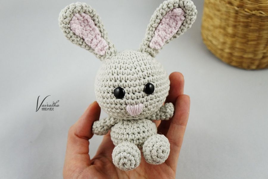 Uroczy króliś wykonany ręcznie na szydełku z wysokiej jakości włóczki bawełnianej (nie mechaci się!). Wypełniony antyalergicznym wypełnieniem poliestrowym, wszystkie części ciała solidnie przyszyte, nosek wyhaftowany, a oczy - to tzw. "safety eyes" - nie do wyciągnięcia! Zabawka bezpieczna dla dzieci!