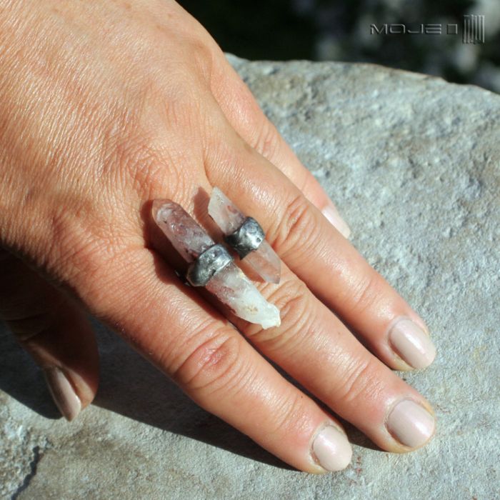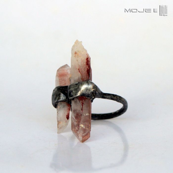 Pierścionek z dwoma kawałkami nie do końca bezbarwnego kryształu górskiego - zawiera prawdopodobnie hematyt, który podbarwia go na brązowawy kolor zasuszonej krwi...
