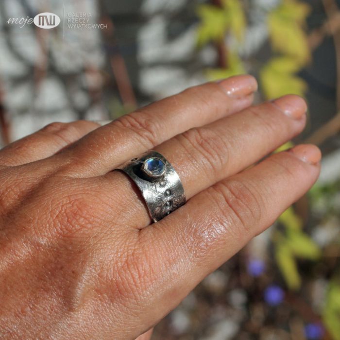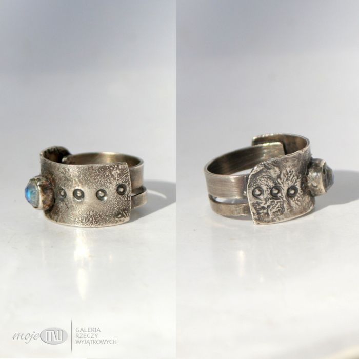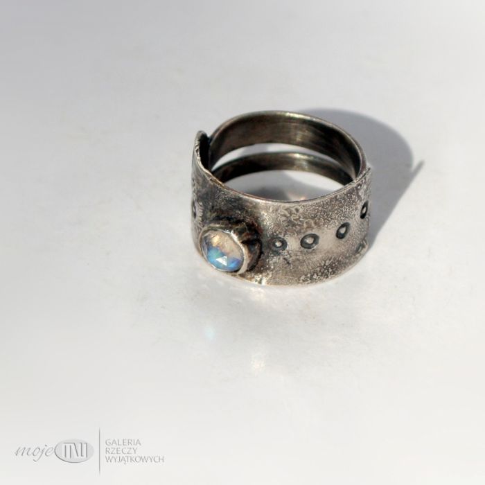 Pierścionek/obrączka z oksydowanego srebra próby min. 925 z fasetowanym kamieniem księżycowym. Na obrączce jest motyw zwielokrotnionego kółeczka.