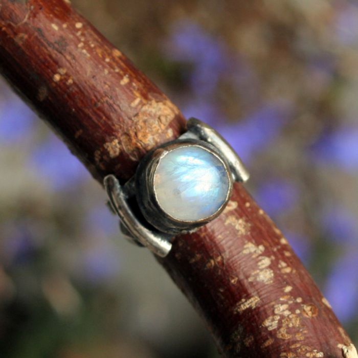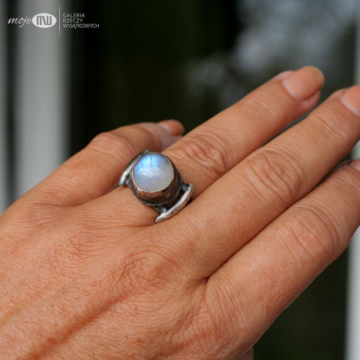 Duży, okrągły kamień księżycowy z piękną błękitną emanacją oprawiony jest w srebro próby min. 925. Srebro jest oksydowane i przecierane. Pierścionek jest rustykalny i efektowny.