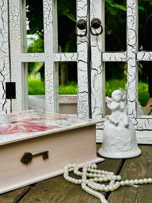 Drewniane i oryginalne pudełko na drobiazgi, biżuterię czy pamiątki o wymiarach : 21 cm x 17 cm x 7 cm.