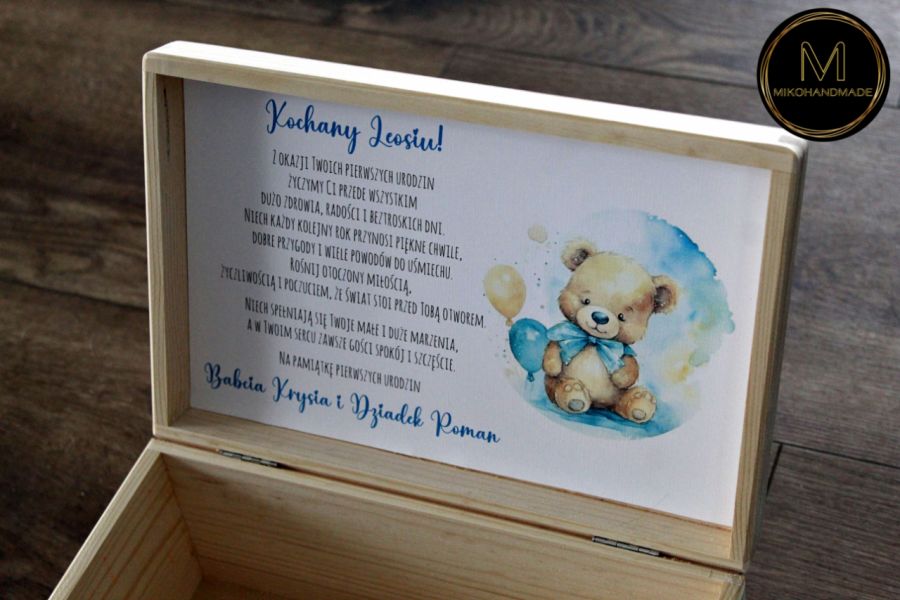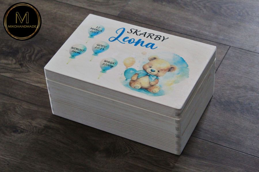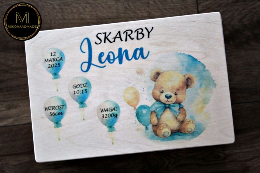 Na wieczku skrzynki znajduje się uroczy miś, który czuwa nad zawartością. Centralnym punktem jest personalizowana metryczka urodzinowa, umieszczona na balonikach, zawierająca najważniejsze dane Maluszka.
