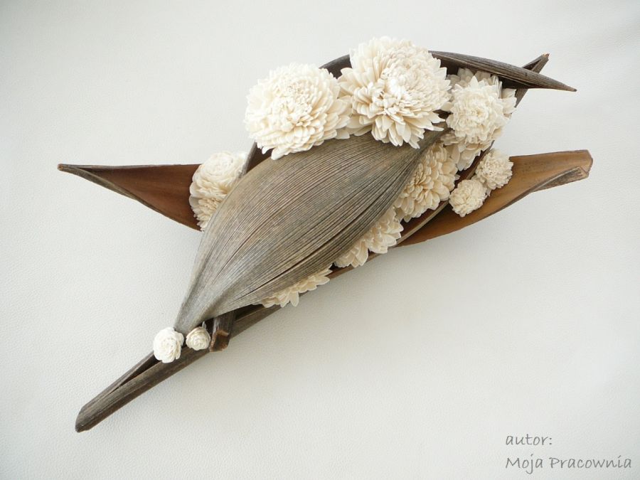 Dekoracja z suszu egzotycznego w stonowanych barwach, z kremowymi kwiatami w roli głównej. Do postawienia na stole, kominku, meblach itd.
