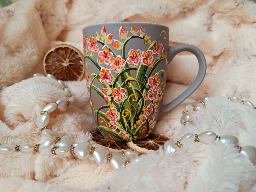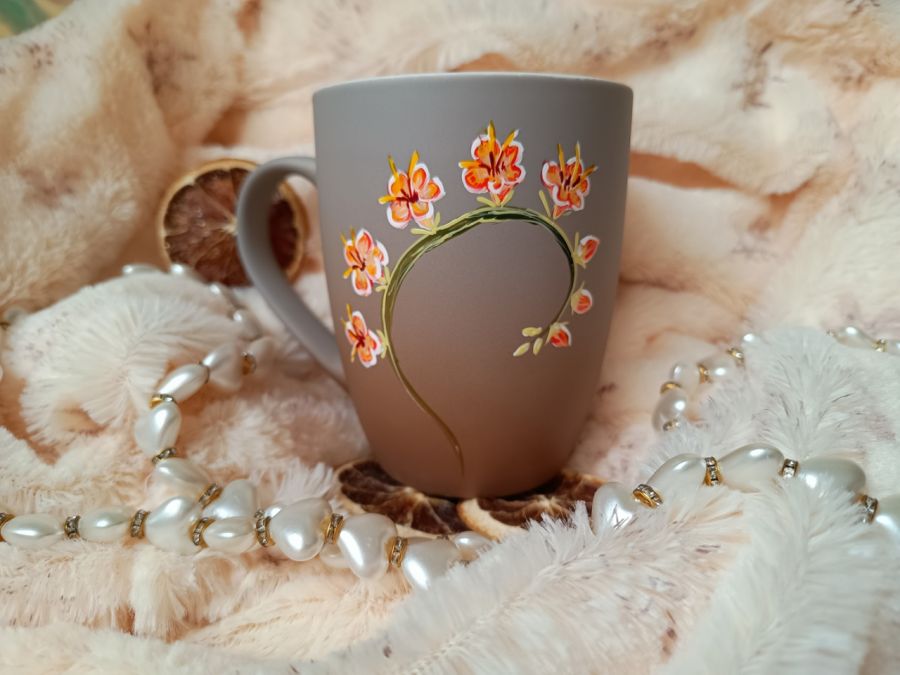 Ręcznie malowany kubek z kwitnącymi kwiatami.
