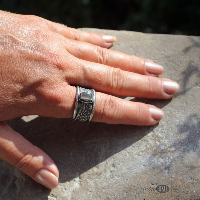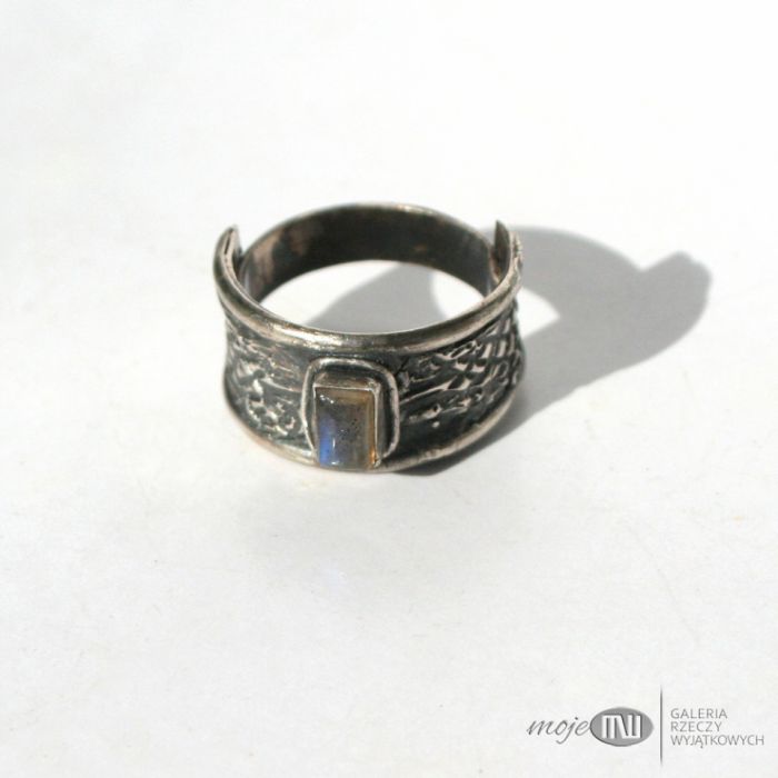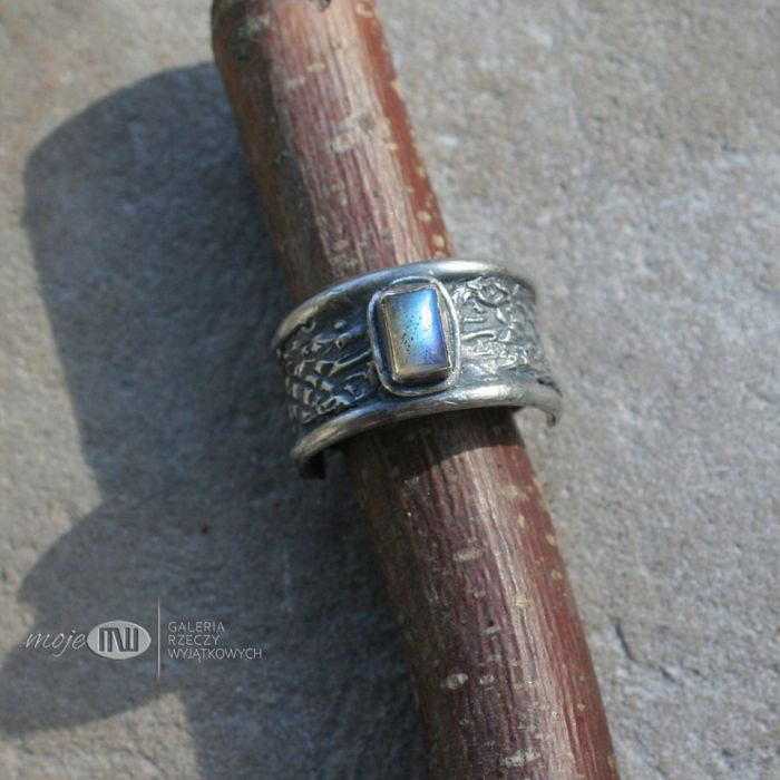 Szeroka srebrna obrączka / pierścionek o rustykalnym charakterze ze srebra próby 925 i wyższej. Centralnie umieszczony jest prostokątny labradoryt w szaro-niebieskim kolorze. Srebro jest oksydowane i przetarte dla wydobycia nieregularnej faktury i szczegółów. Może to być męski pierścionek.