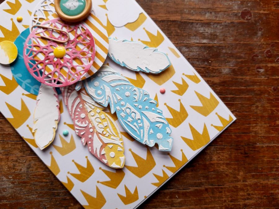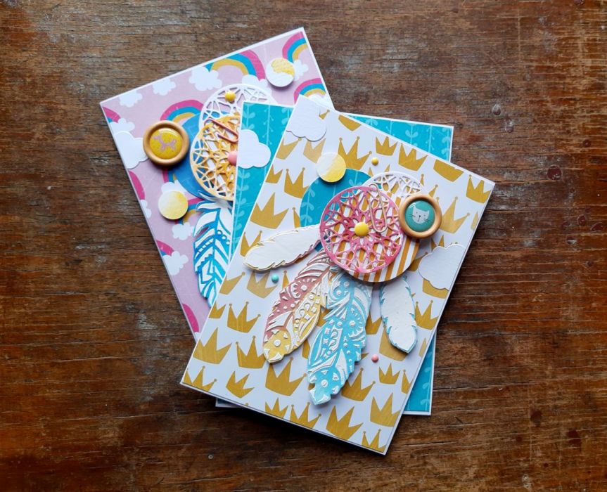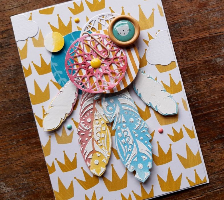 Wyjątkowa ręcznie wykonana kartka na każdą okazję z motywem łapacza snów. Kartka została wykonana w technice scrapbookingu oraz mixed-media, z ozdobnego papieru do scrapbookingu wysokiej jakości, ozdobiona akrylowymi kropelkami oraz kolorowym guzikiem. Kartka w formacie 12,1 cm x 16,7 cm, w środku znajduje się biała wkładka, na której można wypisać życzenia, sprzedawana jest razem z białą kopertą. Kartka została zaprojektowana przeze mnie, dokładnie przemyślana i bardzo starannie wykonana. Pasuje na każdą okazję, dla dziecka i osoby dorosłej. Proszę o informację, jaki napis ma pojawić się na kartce, w wyniku braku tej informacji, wybiorę uniwersalny napis "Moc życzeń". Serdecznie zapraszam do zakupu tej unikatowej kartki.