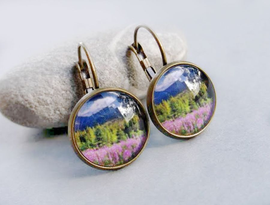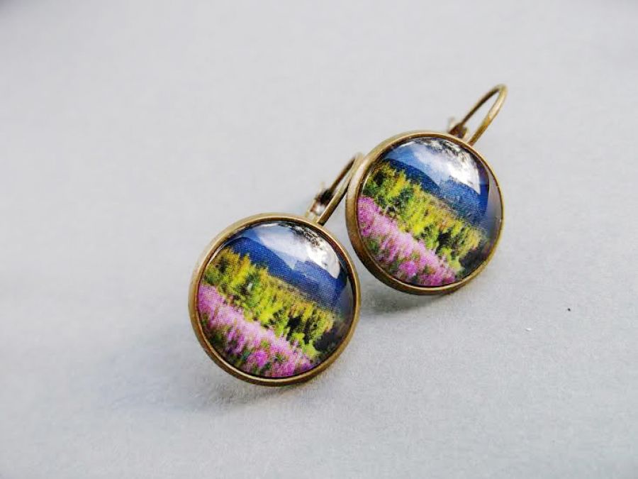 Romantyczne kolczyki z grafiką. Zamykane bigle, oprawa w kolorze mosiądzu. Metal: mosiądz.