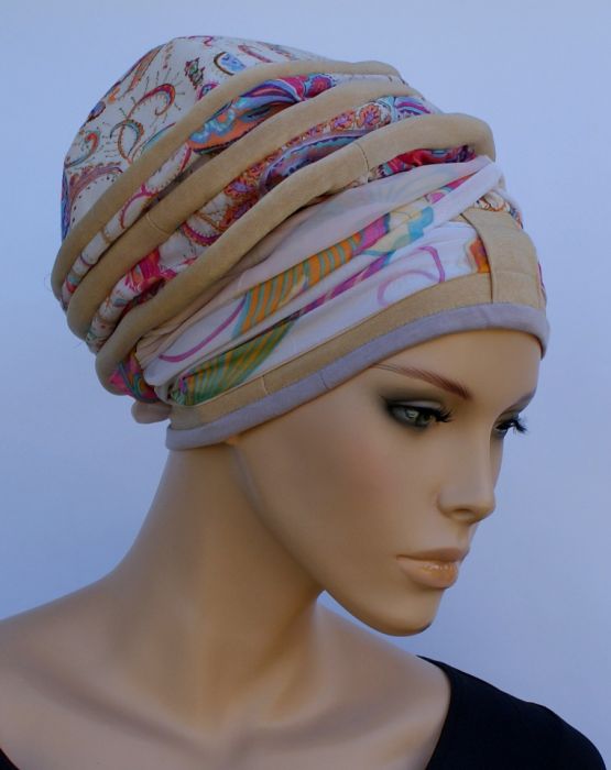 Lekki turban uszyty z cieniutkich materiałów, na delikatnej podszewce z batystu. Połączenie różnych gatunków tkanin. Doskonałe nakrycie głowy na dzień i wieczór, plażę w kurorcie, centrum wielkiego miasta lub do ogródka... WYJŚCIE AWARYJNE jeśli zabrakło wody w kranie albo nie zdążyłaś zadbać o fryzurę. Ucieczka od peruki dla kobiet po chemioterapii. Lekki, przewiewny, w uniwersalnym rozmiarze, z możliwością różnych wariantów zamotania mobilnej szarfy (można nosić jak czapkę, bez szarfy przewleczonej przez szlufkę z tyłu). Specjalna konstrukcja pozwala zachować właściwą formę po praniu.